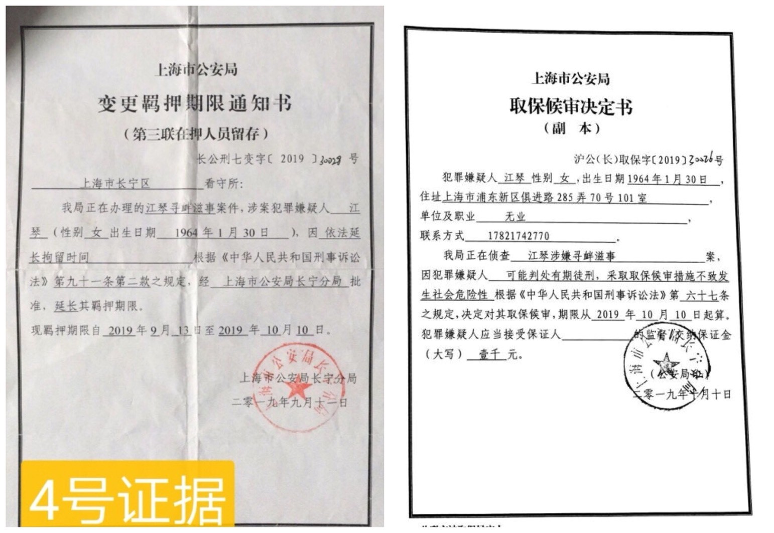 江琴涉嫌寻衅滋事案。2019年9月11日上海市公安局变更羁押期限通知书和2019年10月10日上海市公安局取保候审决定书。(受访者供图)