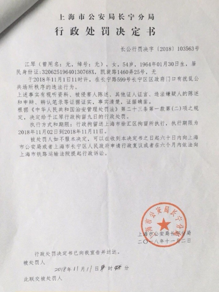 美籍华人访民江琴称被以“莫须有”的罪名拘捕。2018年11月2日,上海市公安局长宁分局行政处罚决定书显示:以有扰乱公共场所秩序的罪名拘留九日。(受访者供图)