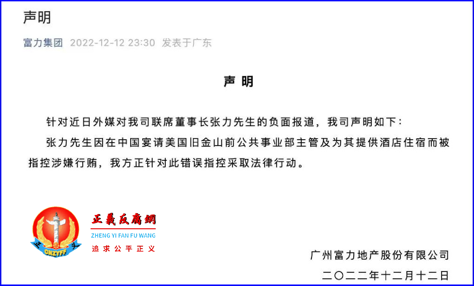 广州富力地产公司(02777.HK)12月12日晚间发布声明,称“张力先生因在中国宴请美国旧金山前公共事业部主管,及为其提供酒店住宿,而被指控涉嫌行贿,我方正针对此错误指控采取法律行动。”