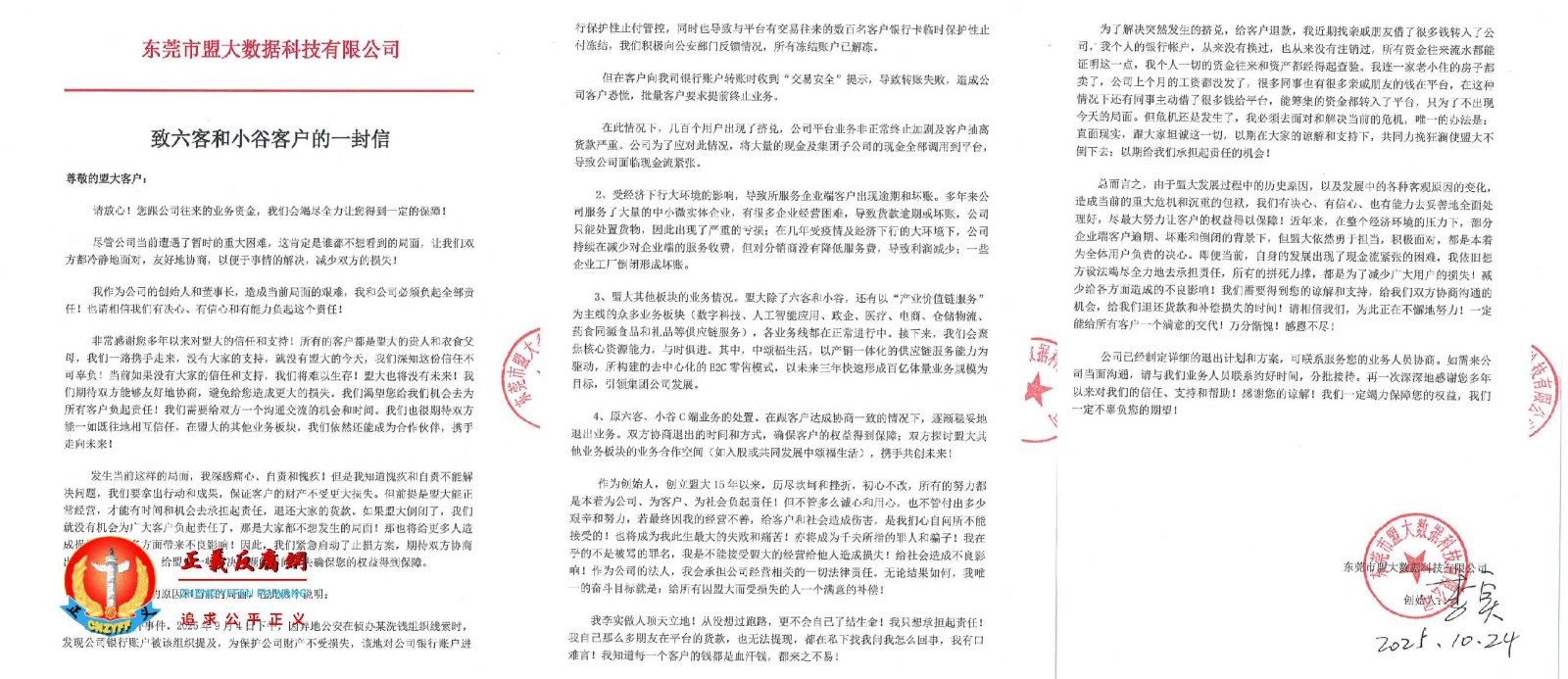 10月24日,盟大集团官方微信公众号发布了一封《致六客和小谷客户的一封信》。信中表示:“几百个用户出现了挤兑,公司平台业务非正常终止加剧及客户抽离货款严重。……,公司为了应对此情况,将大量的现金及集团子公司的现金全部调用到平台导致公司面临现金流紧张。”