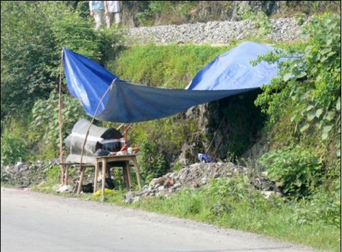 来到山顶,记者发现在这些小煤窑设施十分简陋,一块篷布四角用木棍撑起就是厂房,打矿的机器及小发型电机安放在隐蔽的小山洞里,还有些矿与矿之间的距离相隔不到100米。