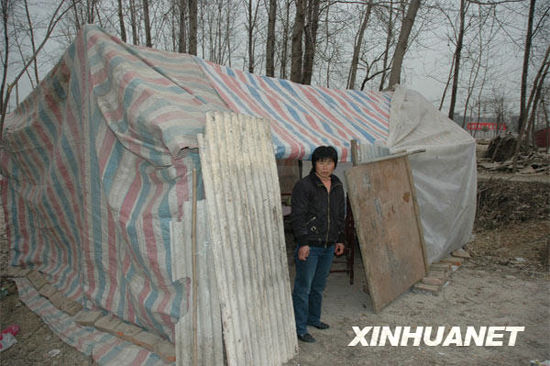 拆迁户韩光勇站在棚子门口,棚子旁是被强拆的房屋。记者 程士华 摄